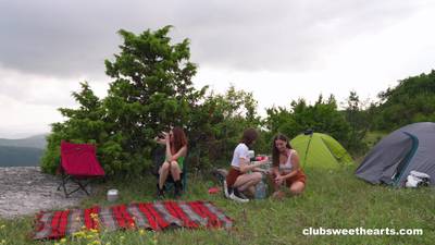 Ces quatre teens ont organisé un voyage de randonnée. Elles ont trouvé un endroit pour camper et une fois installées, elles commencent à s'amuser ensemble.