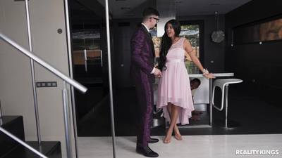 Yorgelis Carrillo habillée pour une soirée dansante, abandonne son petit ami intello pour sucer la grosse bite de son coloc Jesus Reyes, qu'elle chevauche sur le lit.