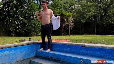 Cet homme prend le soleil tout nu alors que le nettoyeur de la piscine le voit ! Il le rejoint et commence à lui sucer la bite.