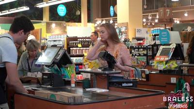 On voit bien ses seins à travers le chemisier transparent qu'elle porte. C'est une exhibitionniste et c'est pour cela qu'elle aime faire du shopping comme ça.