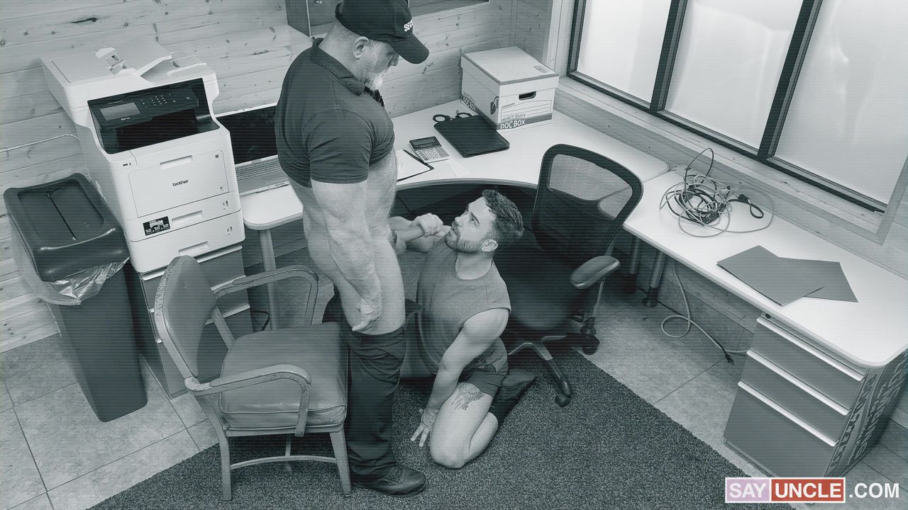 Ce garde DILF a surpris ce mec en train de voler. Il le supplie de ne pas appeler les flics et pour obtenir sa liberté, il se met à genoux pour sucer la bite