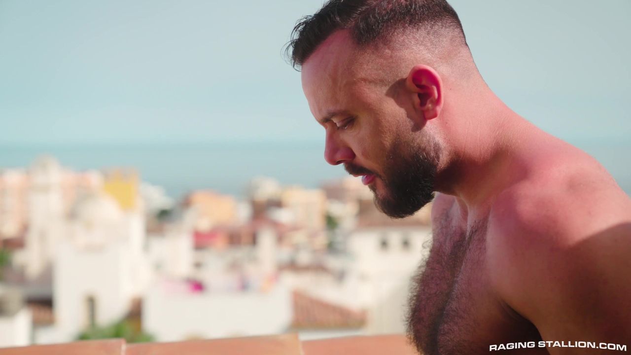Après une longue promenade sur la plage, il était temps de rentrer. Sur la terrasse, Sir Peter sort sa grosse bite pour remplir la bouche d'Andrew Delta