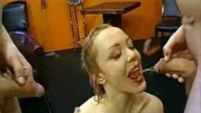 Cette femme adore le foutre et après un bon gang bang elle se fait remplir la bouche de foutre.