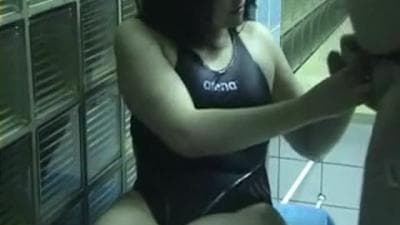 Dans les vestiaires, cette petite cochonne brune prend son pied en léchant le pénis d'un mec qu'elle va tout simplement faire éjaculer !