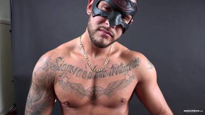 Un mec masqué, musclé, rasé et tatoué, se branle peinard devant son miroir, il finit posé pour bien se branler jusqu'à éjaculer sur son ventre.