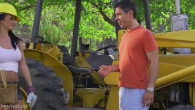 Une brune en mode ouvrière de chantier va se faire baiser devant une pelleteuse par un collège qui va bien faire les choses