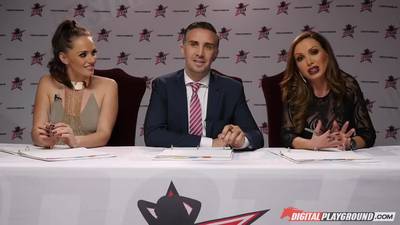 Cette jolie blonde aux gros nichons ne va pas hésiter à sucer un mec en back stage juste après son passage
