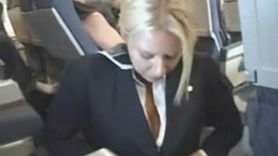 Une hôtesse de l'air très gourmande va pomper la grosse queue d'un passager qui ne regrette pas la prestation.
